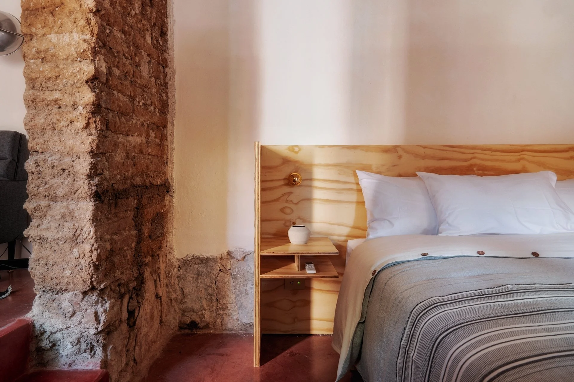La experiencia de diseño más especial. Esta suite con cama Queen Size y sala de estar, fue intervenida por Raúl Cabra para ofrecer un lujoso ambiente dividido en dos ambientes por un bello arco de adobe original, revelando el carácter histórico de nuestra Casa.