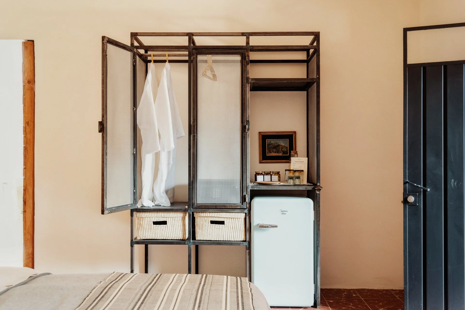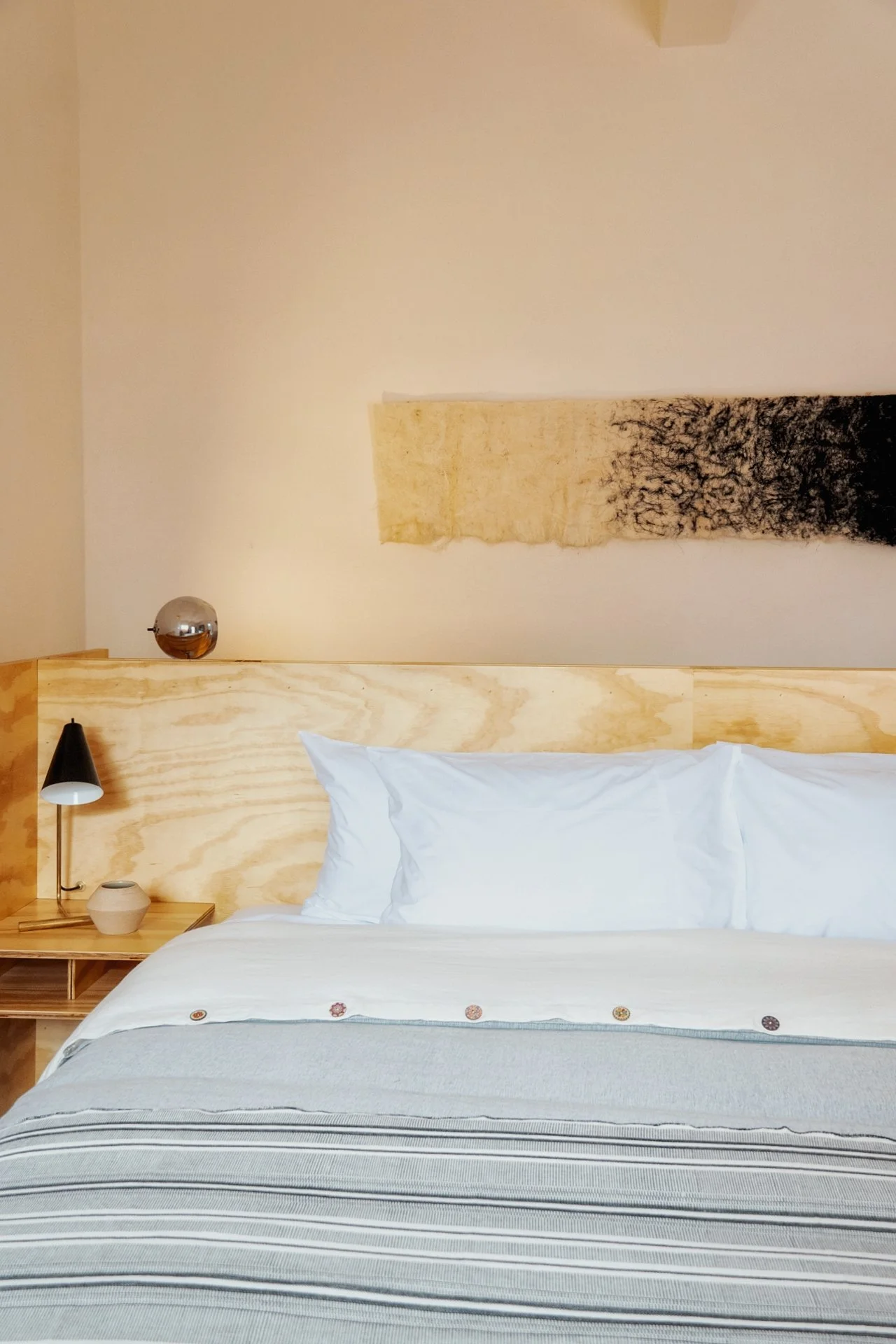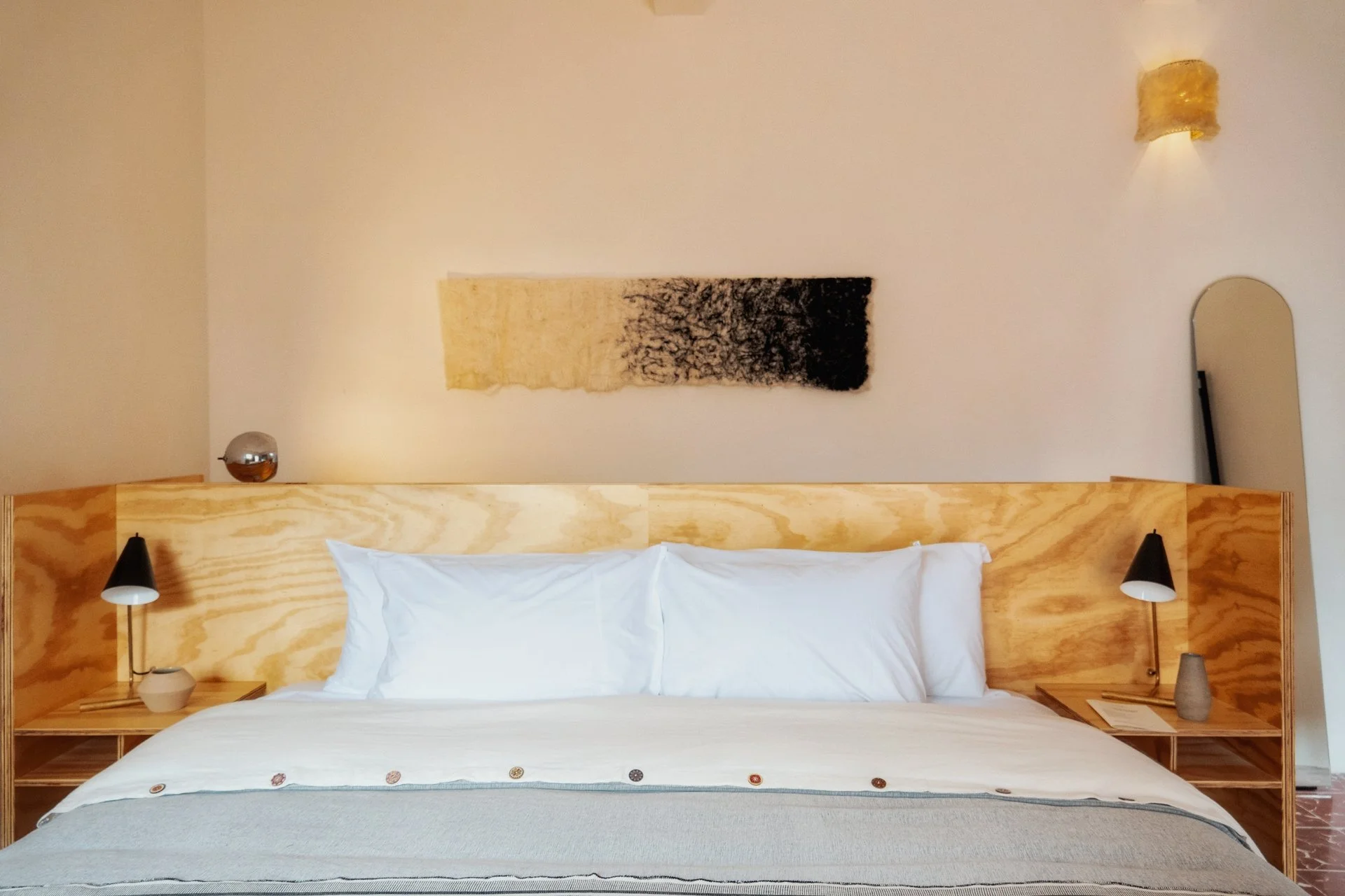 This King Room fosters a dialogue between rustic and industrial elements, thoughtfully curated by designer Raúl Cabra. Prominent textile art and a natural fiber lamp from FIBRA bathe the space in warm, inviting light. Select vintage pieces from Cabra’s personal collection celebrate Mexico’s rich artisanal heritage, adorning the custom wooden headboard with integrated workspace. The bright, open private bathroom features polished slate walls and industrial-style copper fixtures, seamlessly merging aesthetics with comfort and function.