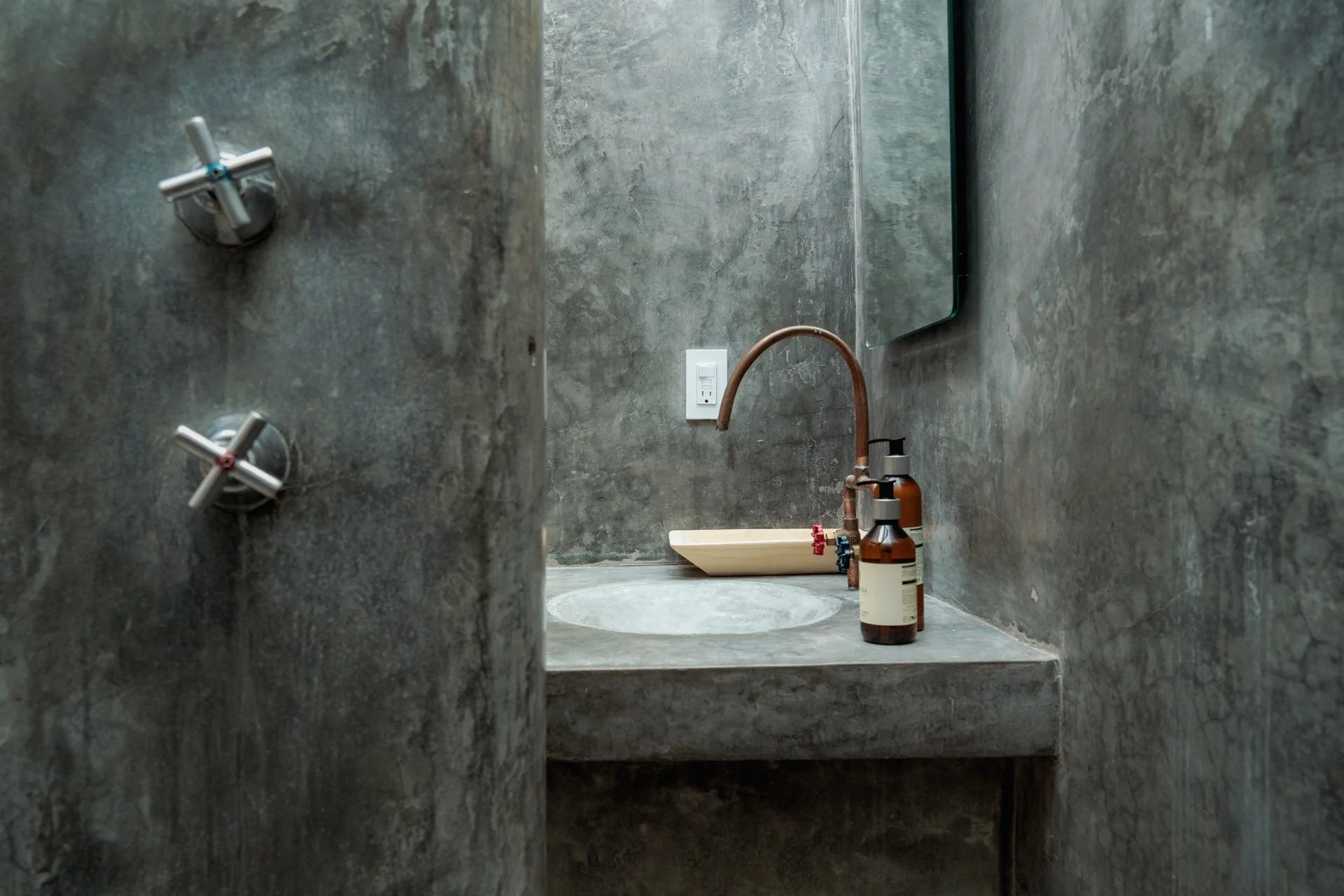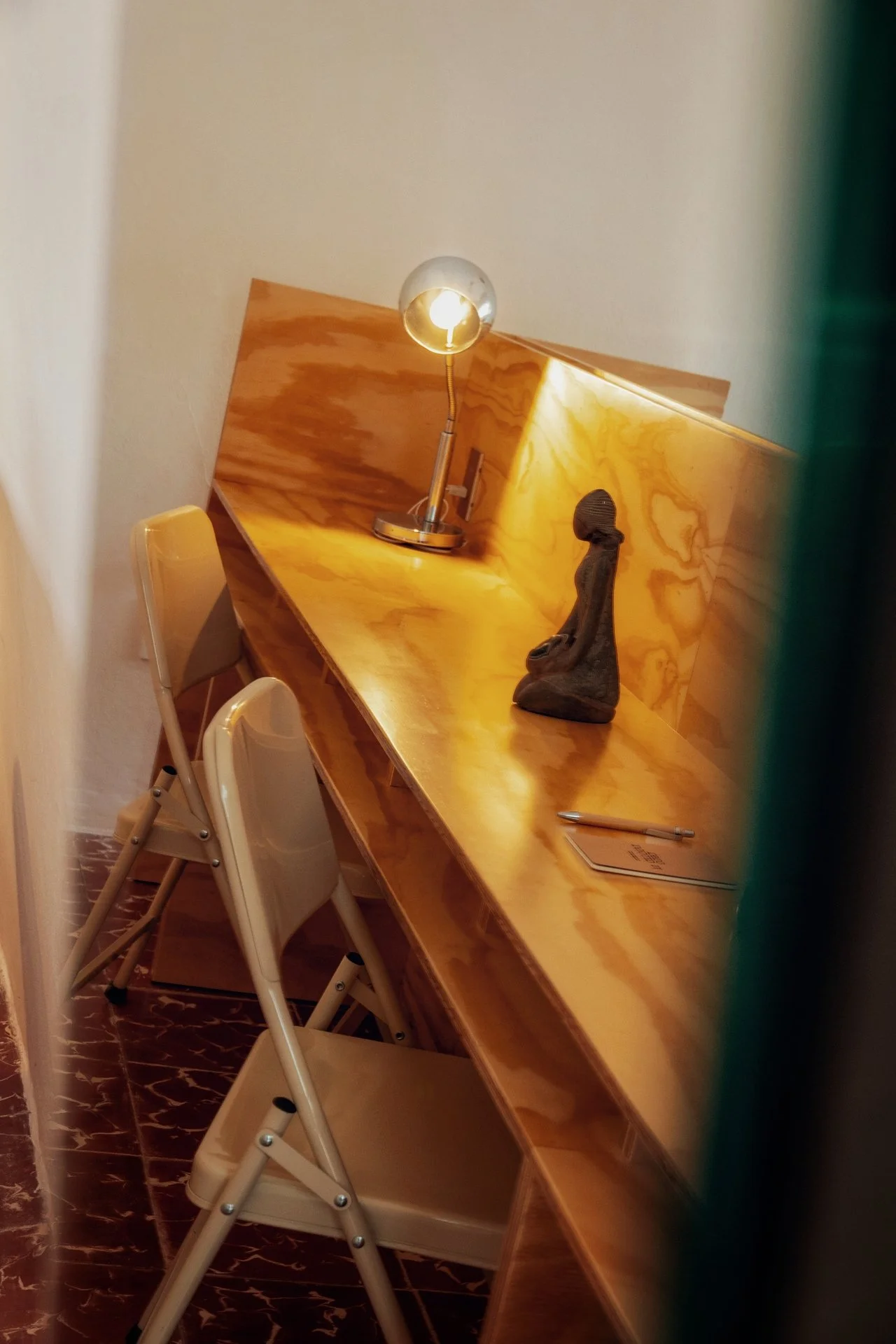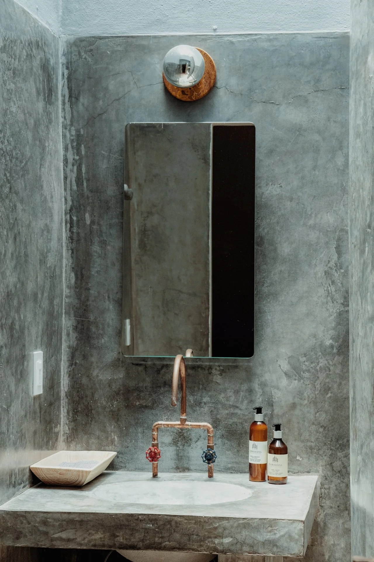 This King Room fosters a dialogue between rustic and industrial elements, thoughtfully curated by designer Raúl Cabra. Prominent textile art and a natural fiber lamp from FIBRA bathe the space in warm, inviting light. Select vintage pieces from Cabra’s personal collection celebrate Mexico’s rich artisanal heritage, adorning the custom wooden headboard with integrated workspace. The bright, open private bathroom features polished slate walls and industrial-style copper fixtures, seamlessly merging aesthetics with comfort and function.